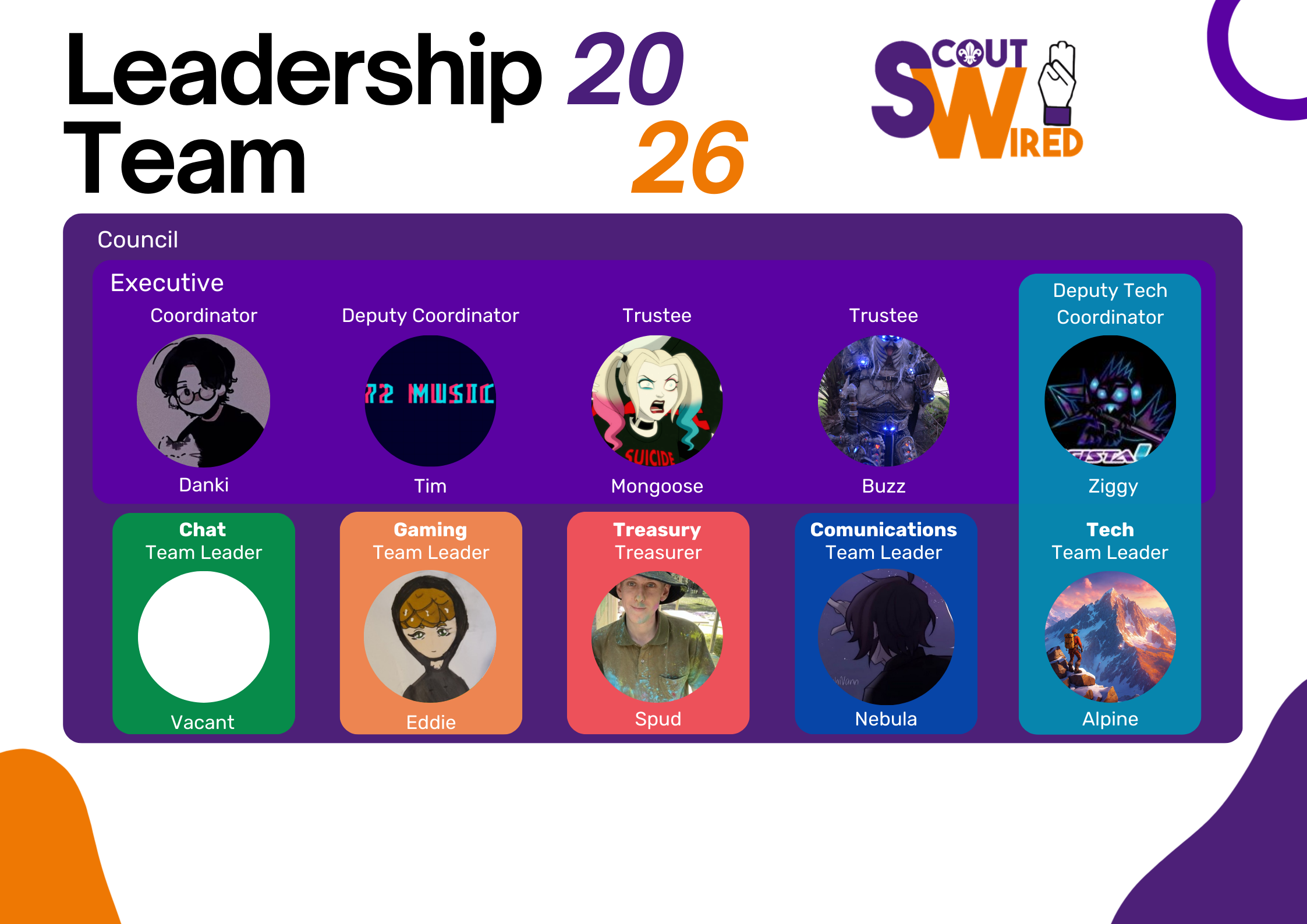 Our team are all carefully selected and trained to ensure the effective running of the services we provide. ScoutWired runs on a two-tier management system and is youth-led. If you are interested in joining our team, please contact us.